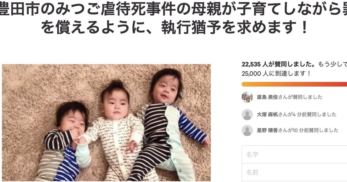 キャンペーン 豊田市のみつご虐待死事件の母親が子育てしながら罪を償えるように 執行猶予を求めます Change Org